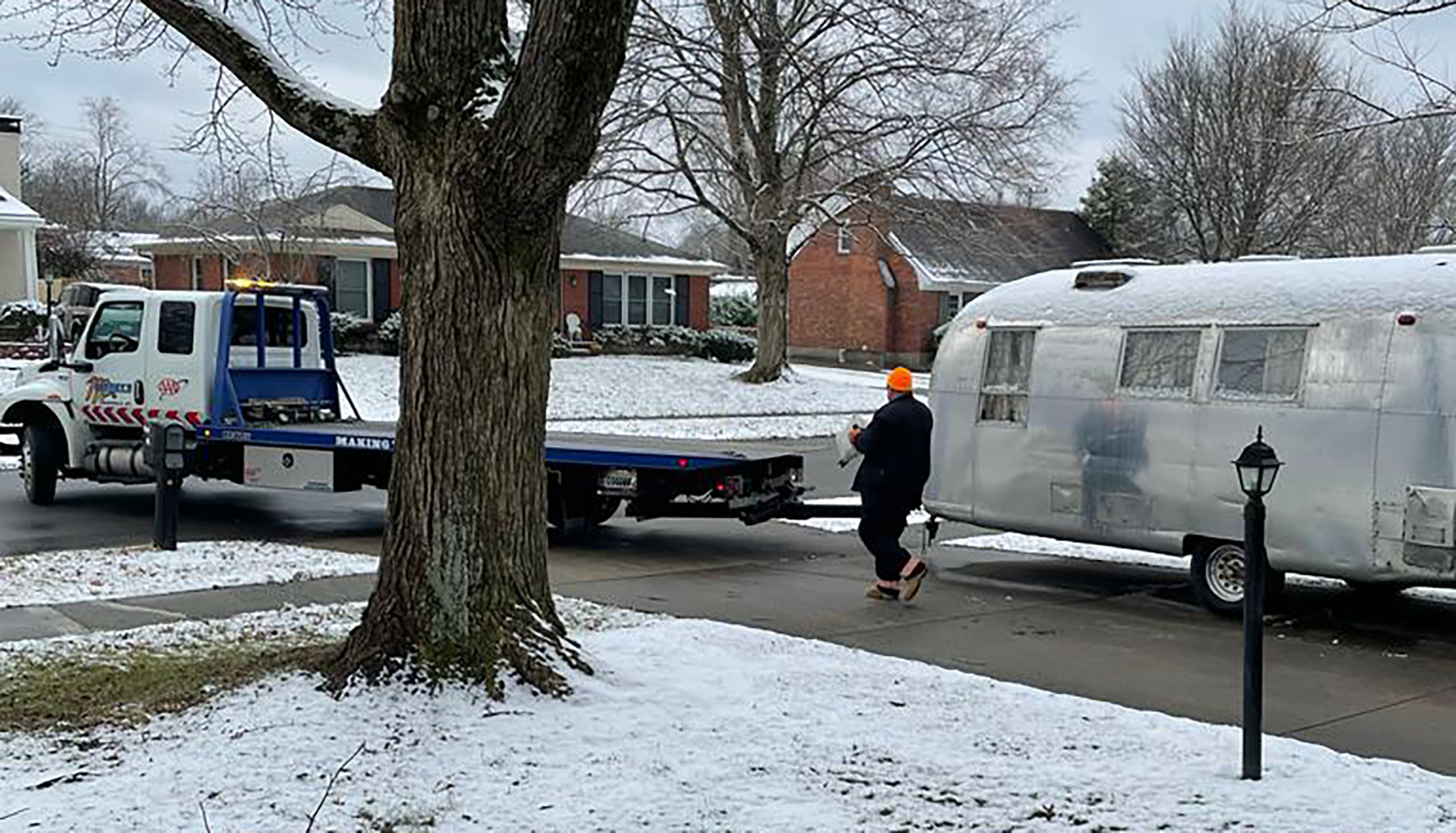 Auf dem Bild wird gerade ein Airstream auf einen Autotransporter verladen. Das Fahrgestell ist zu marode, als dass wir einen Transport auf Achse zum Hafen hätten riskieren können.