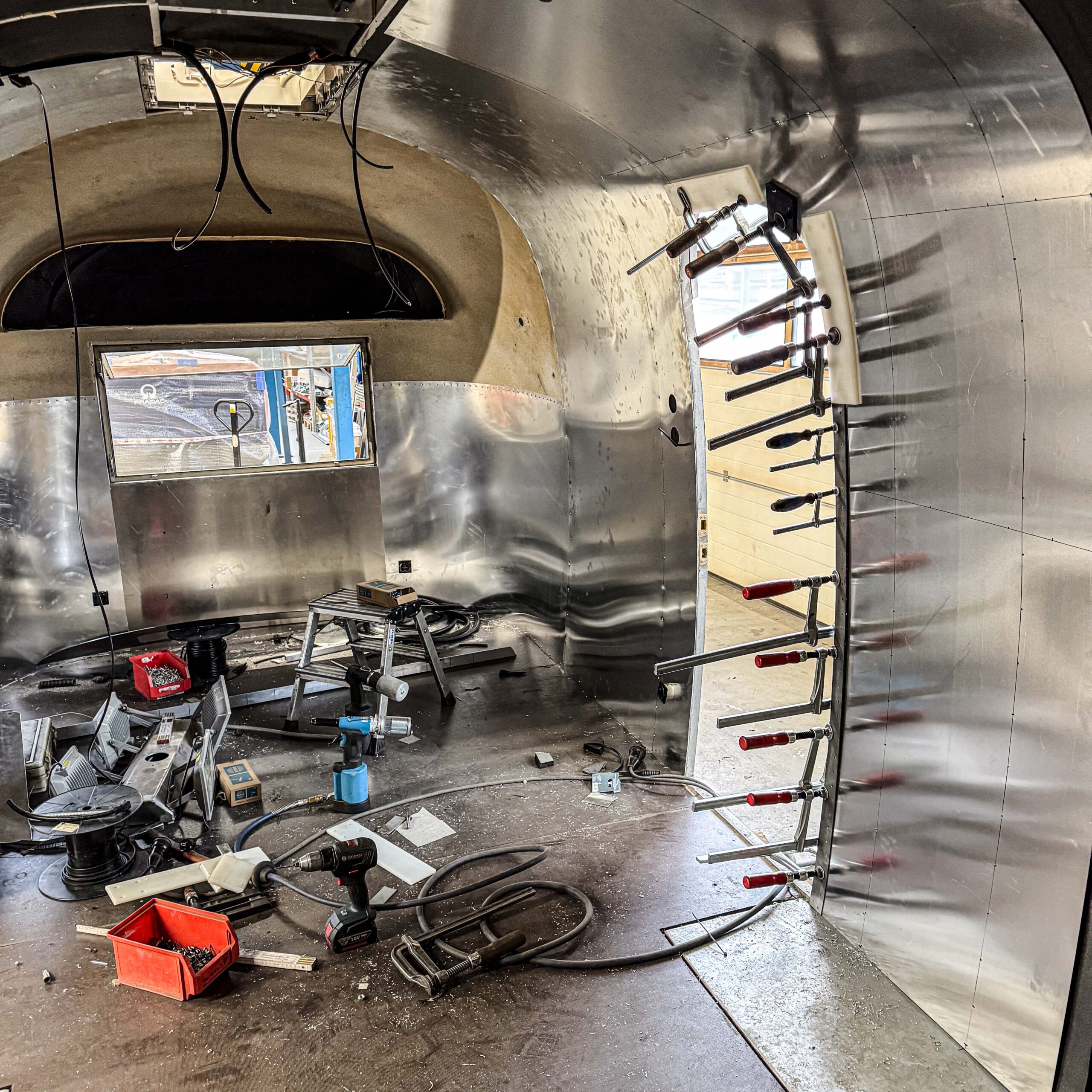 Nachdem die Arbeiten an der Klappe und dem Fahrgestell abgeschlossen sind, machen wir jetzt die Innenverkleidung neu. Unter den Blechen laufen alle Leitungen, die wir später für die Lichter und Steckdosen benötigen. Wenn das abgeschlossen ist, kommt der Boden rein und dann nähern wir uns der Fertigstellung.